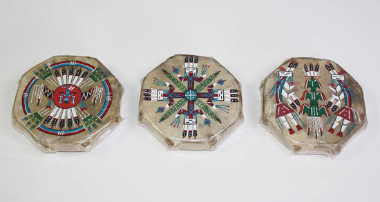 Hand made of Pine Wood and Rawhide Then painted by Navajo sandpainters. patterns will vary; CALL FOR SELECTION